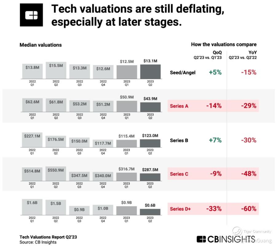 • The later the stage, the sharper the valuation decline year-over-year (YoY) in Q2’23. While the median valuation for seed/angel and Series A rounds fell 15% and 29% YoY, respectively, Series B to Series D+ valuations tumbled between 30% and 60%.​