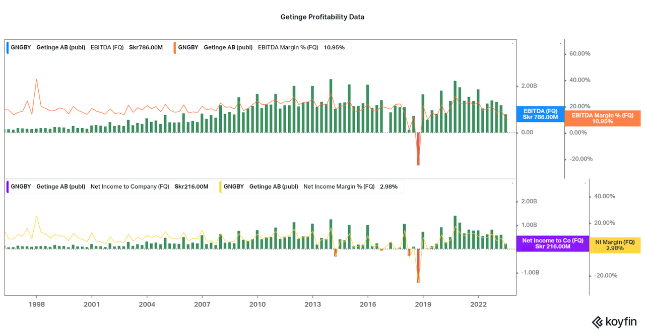 While revenues have plateaued over the past 10 years or so, earnings have reflected a different pattern. During the acute and surgical care bear market in 2016-18 (similar peers faced weakness at the same time), Getinge saw extremely poor margins. This was an abnormal period, and high margins returned despite the slowdown in growth. Unfortunately, a similar market occurred due to the pandemic and, now, 2023 is shaping up to be hard on company profit generation due to the recalls.