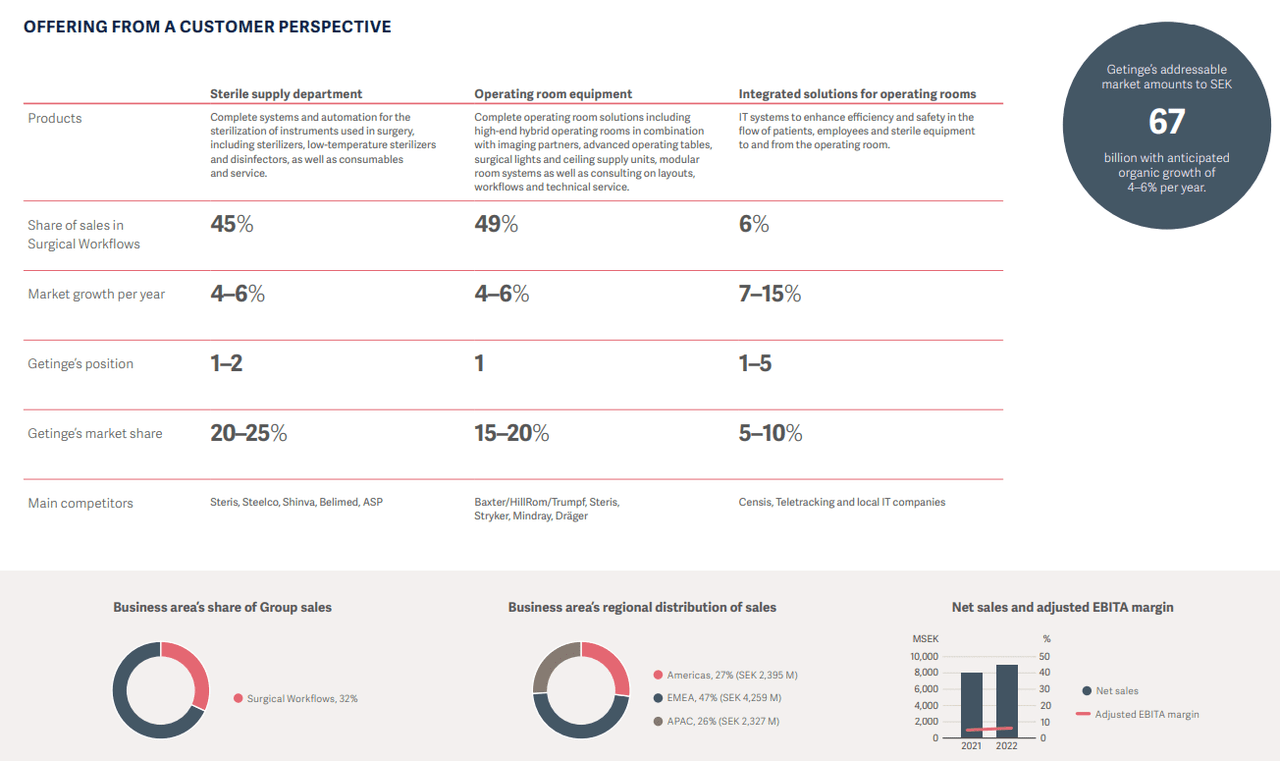 Getinge AB (OTCPK:GNGBY) is a Swedish Healthcare Medical Tech company focusing on three revenue segments: Acute Care, Life Sciences, and Surgical Workflows. The company is small, valued at a $5 billion USD market cap, but offers a leading position across multiple unique niches within its target markets. This includes multiple #1 market share positions over giant competitors like Medtronic (MDT), GE Healthcare (GEHC), and STERIS (STE). Also, thanks to one recent acquisition, Getinge is now looking to battle the goliaths of Thermo Fisher (TMO) and Danaher (DHR) in the bioprocessing market. Unfortunately, Getinge has also suffered through various major headwinds over the past few years and this has led to a suppressed valuation and underperforming financials.