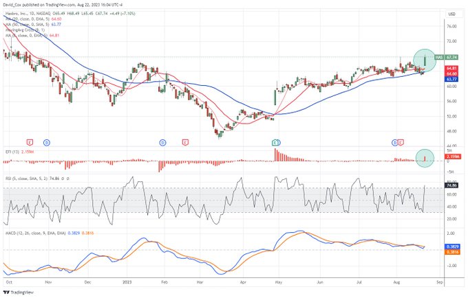 Globally recognized toy company $Hasbro(HAS)$ rises 7% after Bank of America raises earnings expectations for FY on monopoly prospects $HAS shows a breakout pattern on 22 AUG 2023.