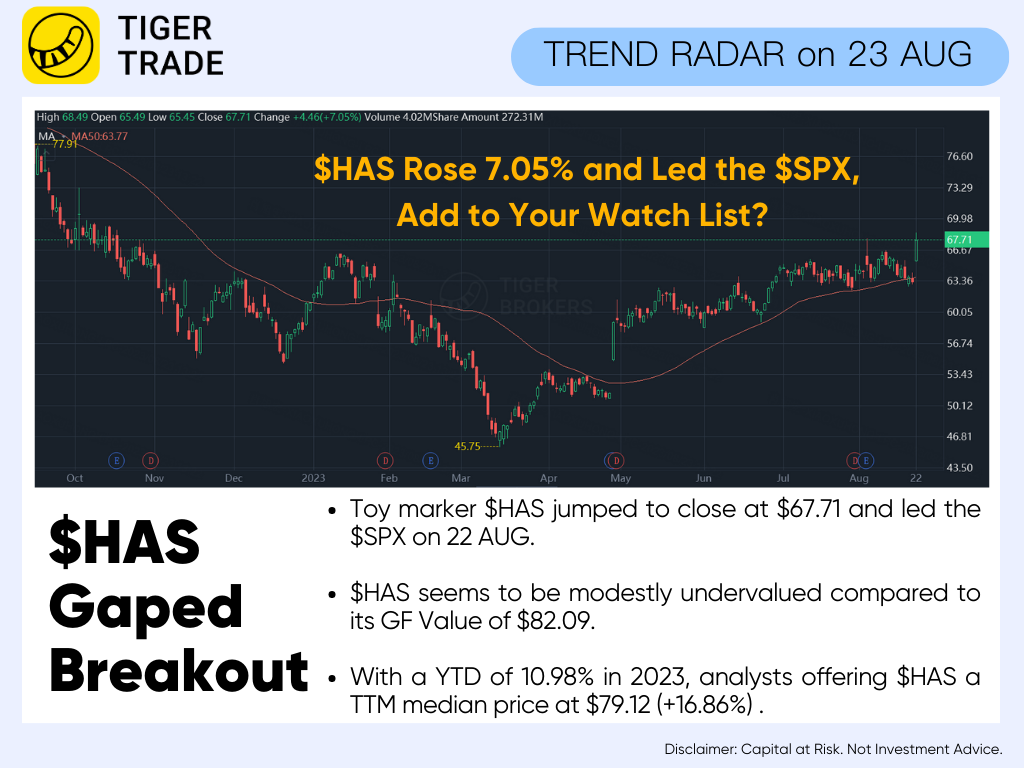 1. $Hasbro(HAS)$ Rose 7.05% and Led the $SPX on Tuesday Trading.