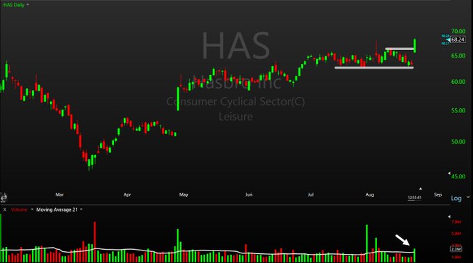 @Evan Medeiros at X platform, he pointed out that $Hasbro(HAS)$ see a nice breakout occurring with fresh 52W highs on volume. Still cheap though…