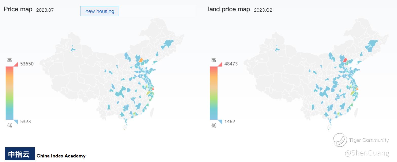 The only regions that principally display a weak uptrend in "new housing" prices are (in order) those surrounding Shenzhen, Shanghai and Beijing. The areas that show a principal uptrend in land prices are (in order) those surrounding Beijing, Shanghai and Shenzhen. All three cities are considered "first-tier".