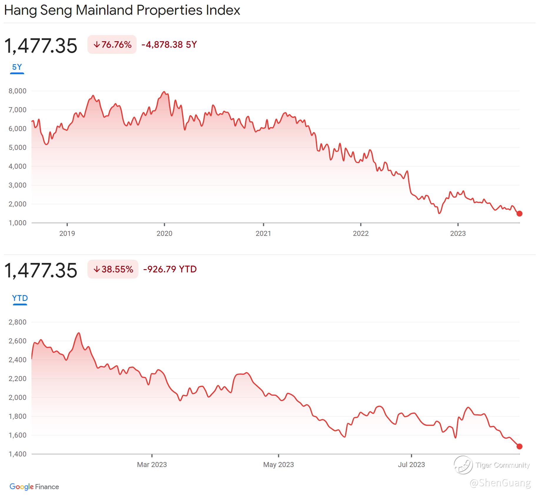 Chinese asset managers' assertions aren't far off the mark. The Hang Sang Mainland Properties Index (Hang Seng ticker: HSMPI) indicates that it has largely been downhill since the peak of January 2020. On a 5-year basis, the HSMPI is down nearly 77% as of the start of the week.