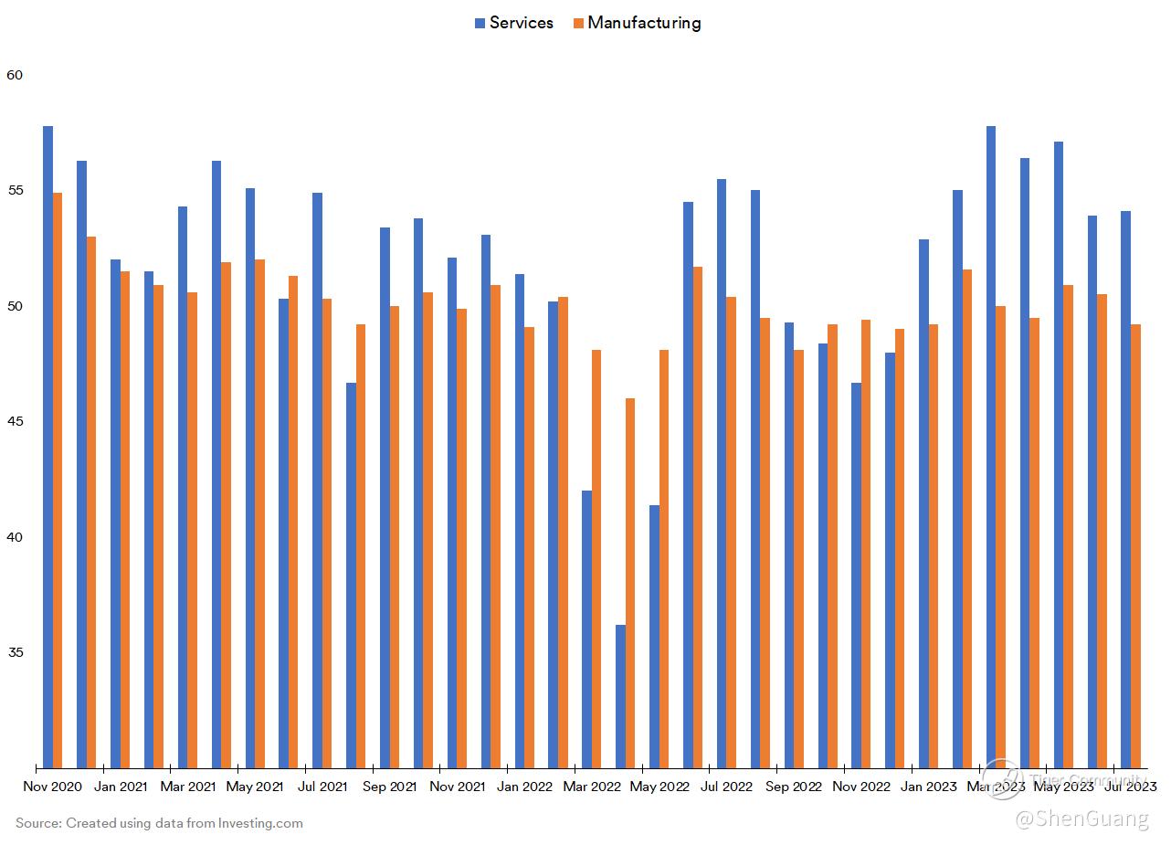 Much like the property sector, another significant pillar of China's economic engine is its massive manufacturing base effectively serving as the "crucible" for most aspects of the Western Hemisphere's consumption (and to varying degrees elsewhere). A comparison of the China Caixin Purchasing Managers Index (PMI) for both Services and Manufacturing shows that China's "foundry" effectively hasn't faltered since June of last year.