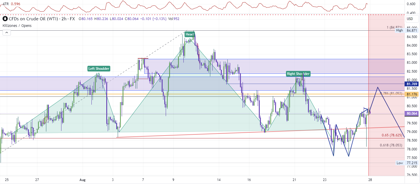 On AUG20, We have a confirmed Inv H&S on WTI with TP at 83.5. Might go down to 80 first. If it can close below 78.9, the H&S is invalidated, but so far so good.