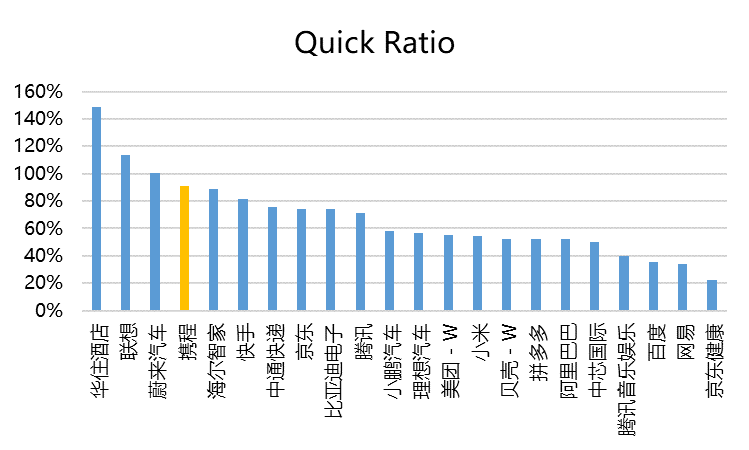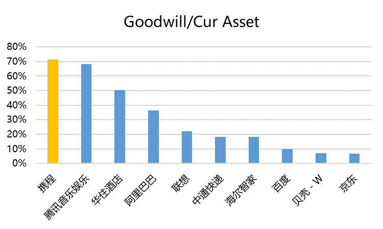 The main factors affecting Ctrip's valuation are its relatively high debt ratio and the substantial goodwill brought about by previous acquisition activities. The ratio of current liabilities to current assets is the highest among components of the $NASDAQ Golden Dragon China Index(HXC)$ and the $HSTECH(HSTECH)$ , and its goodwill-to-current assets ratio is also among the highest, which to some extent lowers its asset quality.