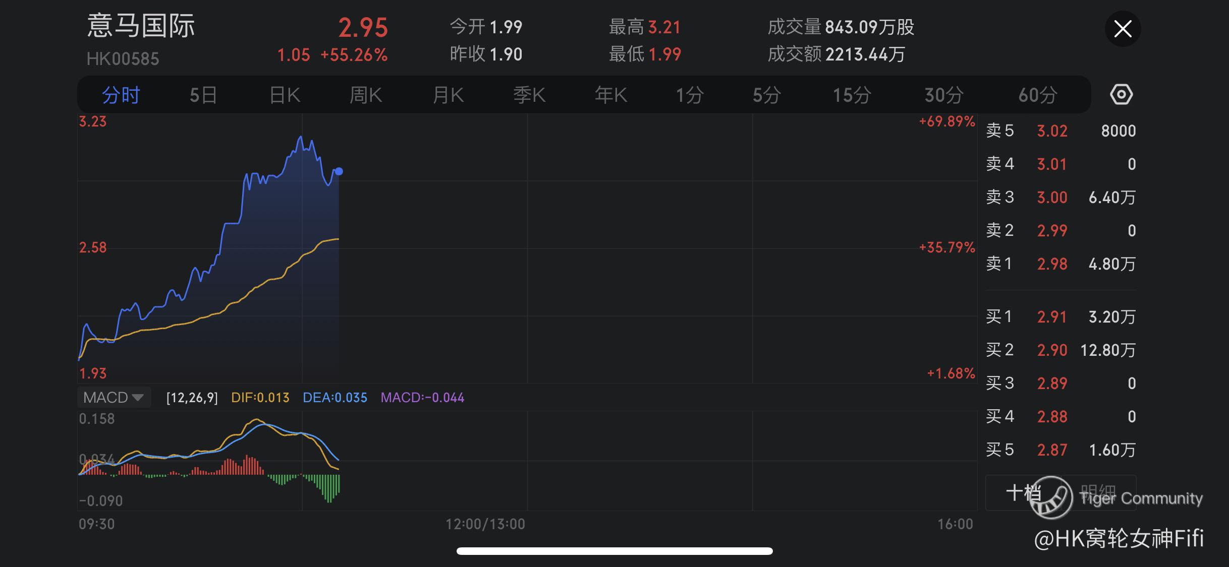 $意馬國際(00585)$ 續漲超50%,截止發稿漲55.26%,報2.95港元,成交額2213.44萬港元。