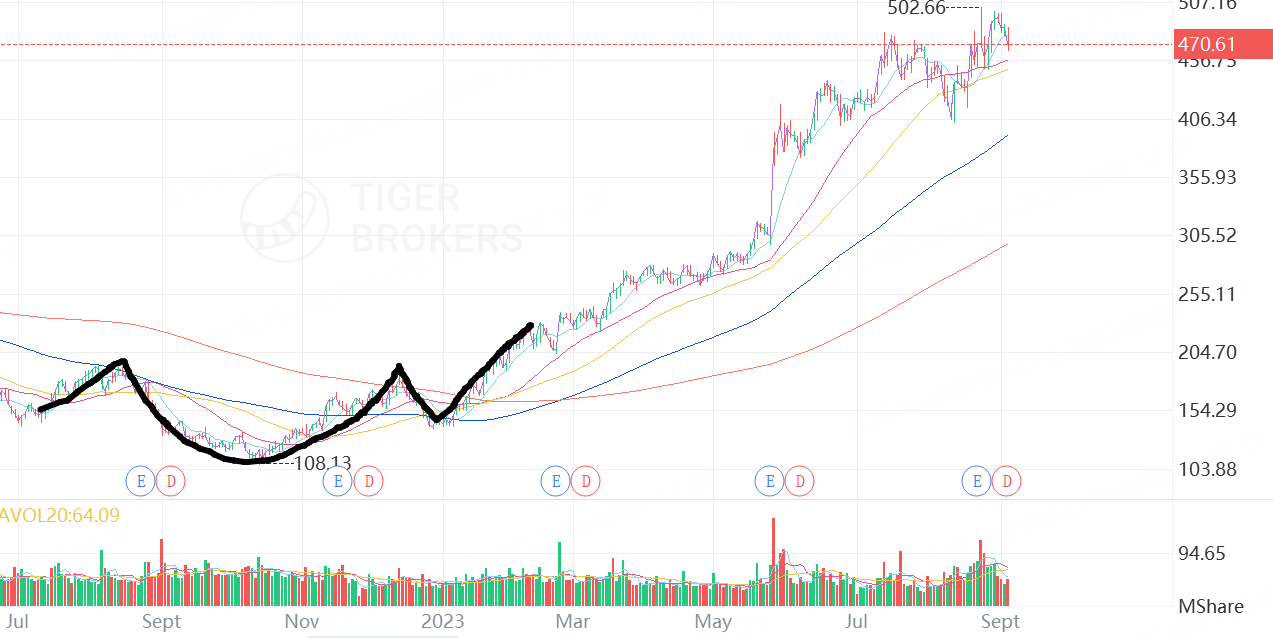 It looks like a teacup with a handle, indicating a signal that the stock price is resuming an upward trend after a period of consolidation and pullback. The essential characteristics of the cup and handle pattern are as follows: