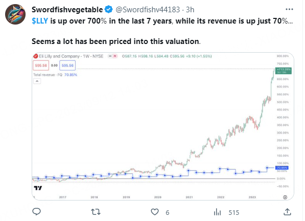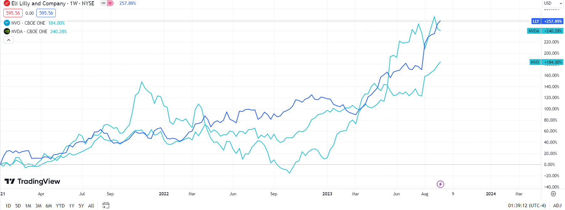 On Monday trading, Weight loss drugs company $Novo-Nordisk A/S(NVO)$ & $Eli Lilly(LLY)$ hit all time high. As of post, $NVO has increased $184% since 2021, and now market value at $446.463B. $Eli Lilly(LLY)$’s current market is $565.362B with 3-year return over 257%,which surpass the return of $NVIDIA Corp(NVDA)$.