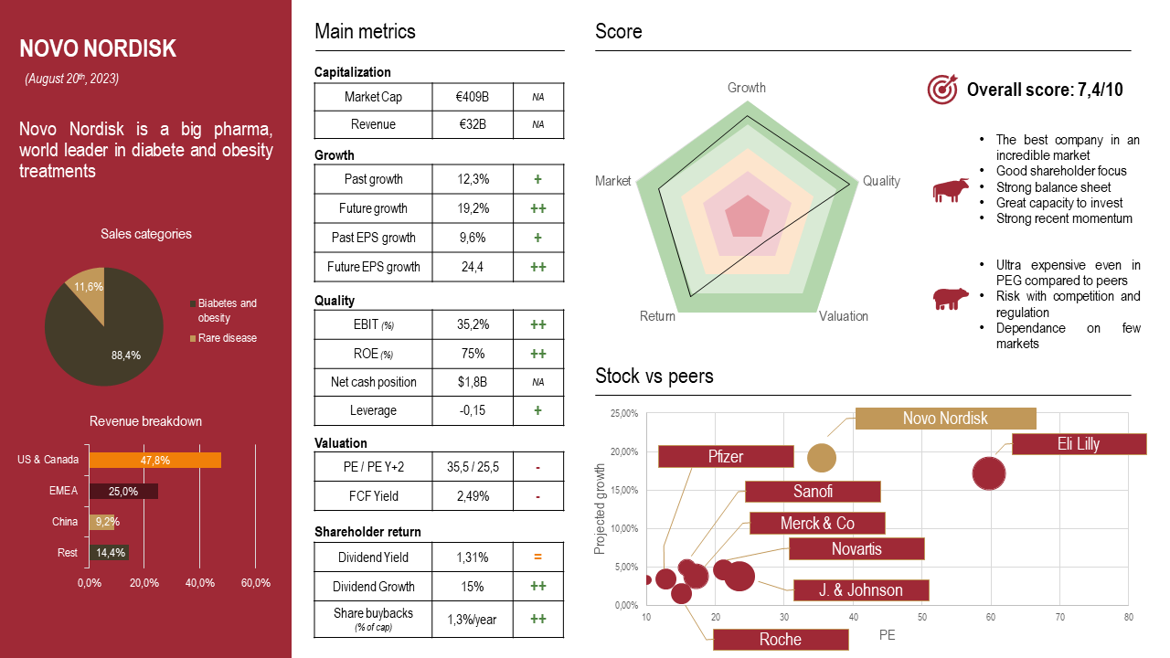 Novo Nordisk has, in recent years, posted record profits, paid hefty dividends, and repurchased shares consistently. This has resulted in the share price rising to historic highs, with the stock having outperformed the S&P 500 by more than 3x in the past 3 years. NVO has, however, become significantly overvalued, and investors may be wondering whether its time to head for the exits. NVO's obesity drug Wegovy could be highly successful, given the prevalence of obesity in the US and globally and the favorable economics of producing and marketing the drug. Despite current supply constraints, the company's growth potential is high due to the increasing global prevalence of obesity and type 2 diabetes and the expected production increase from a new plant in Clayton, North Carolina.