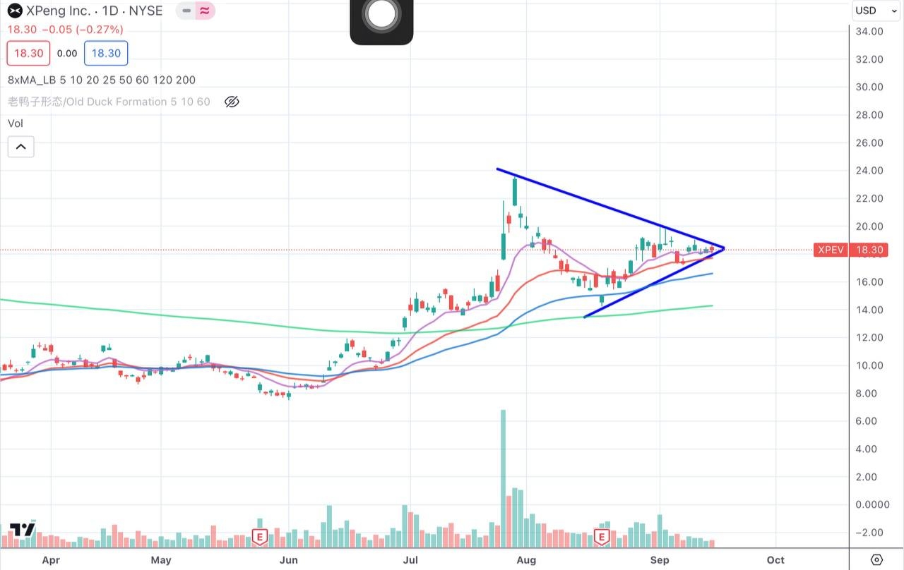 Similar to Tesla, XPeng is also forming a symmetrical triangle pattern since mid August. The fluctuation range is getting smalller at this consolidation phase I believe XPeng will have a higher chance to breakout upwards instead of downwards. It should choose its direction pretty soon. I am $XPeng Inc.(XPEV)$