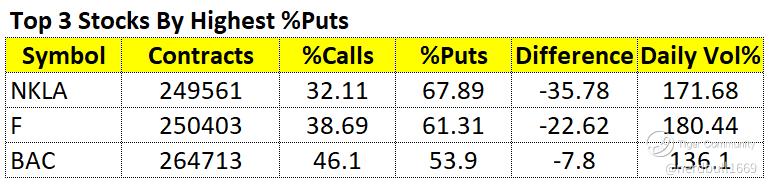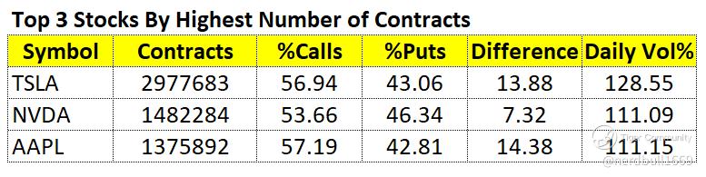 I shall filter the list and assess 3 stocks by the highest contracts, the highest %Calls and highest %Puts.