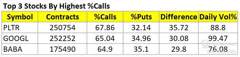 $Palantir Technologies Inc.(PLTR)$ came in with the highest percentage of calls option and also the biggest difference between calls and puts in term of percentage.