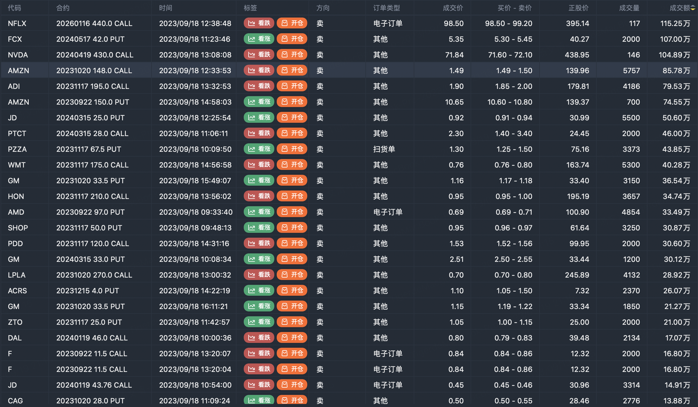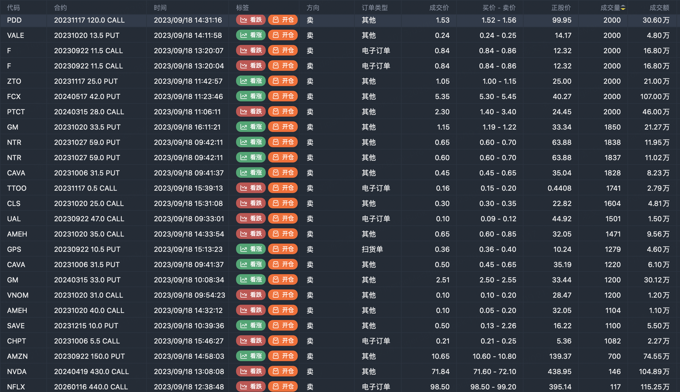 Note: This image data is from Tiger PC. This screen is a significant sell open position for an option contract in the market. A sell of a call option means that the trader believes that the underlying trend has peaked, and a sell of a put option means that the trader believes that the underlying trend has bottomed. These contract openings typically indicate significant activity in the underlying stock, including whether the trader is willing to accumulate a long or short option position.