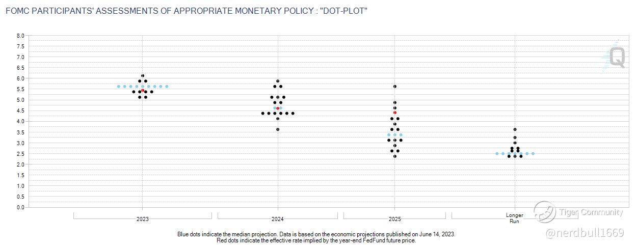 From the dot plot, even though the market does not expect a Fed rate hike but we can see that it is suggested that there will be one more hike this year before rate start to fall steadily down.