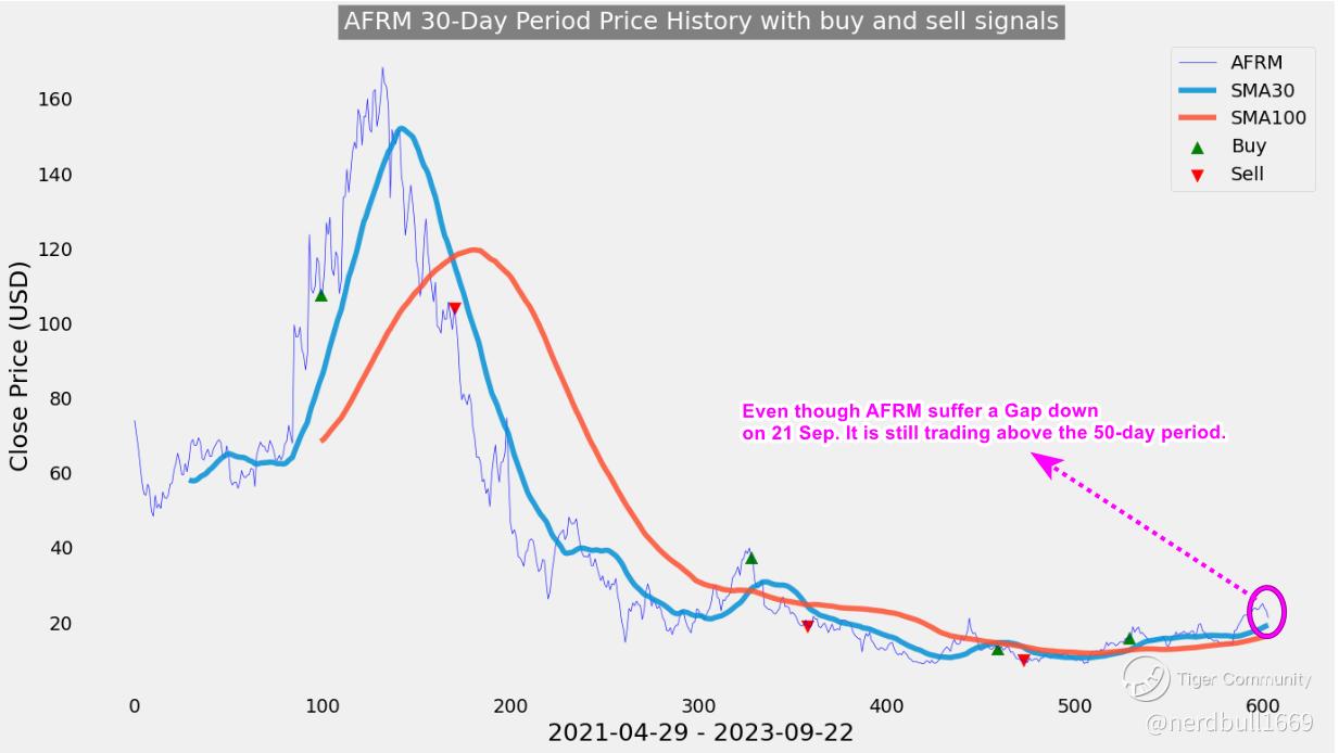 Based on the 50-day MA period, Affirm is still trading above the 50-day moving averages period, despite suffering a Gap down on 21 Sep 2023.