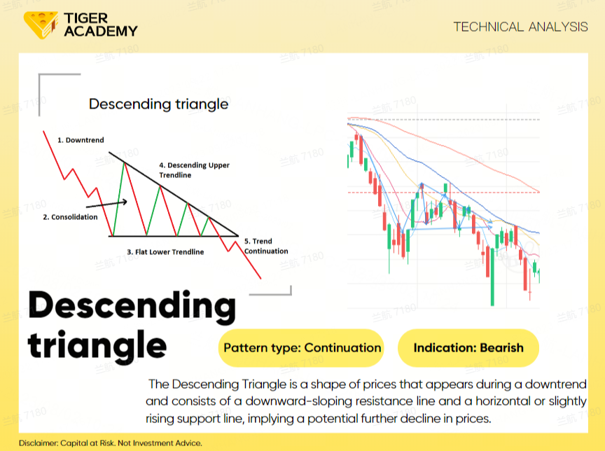 Breakout: The breakout of the Descending Triangle typically occurs when the price breaks through the support line. Once the price breaks the support line, more downward movement is likely, further confirming the downtrend.
