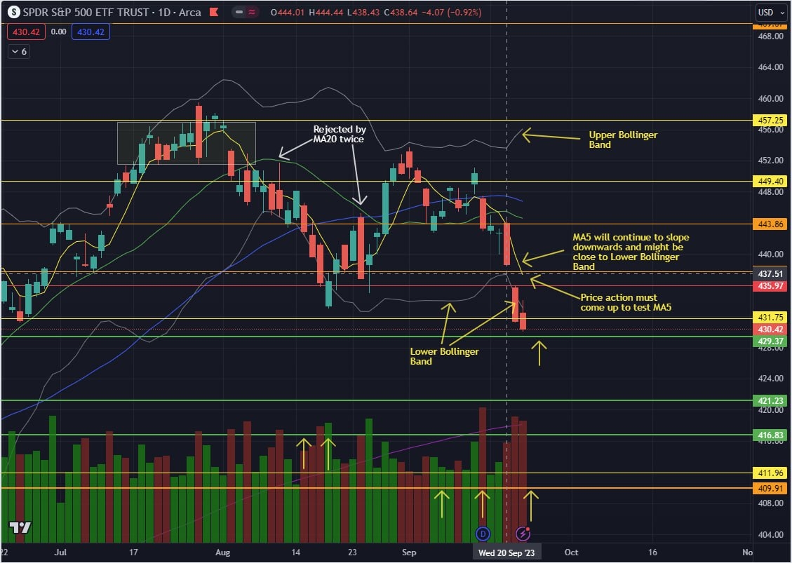 How to navigate a bearish trend rather than just worry; Watch MA5 and Lower Bollinger Band!