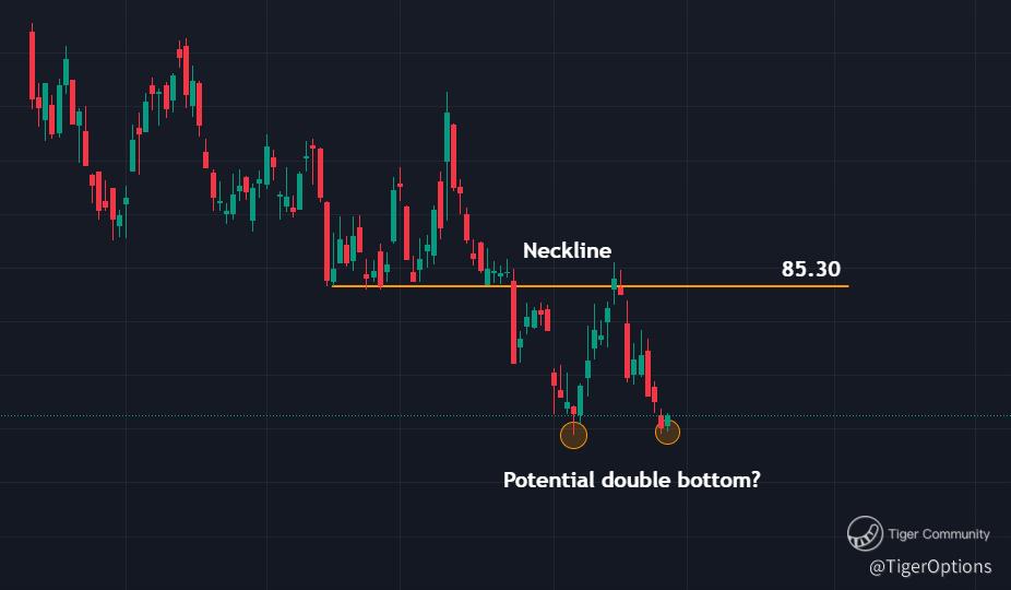 Given the positive developments, the current stock price appears to be forming a potential double bottom pattern. It is crucial to monitor whether the price stabilizes at its current level or moves towards the neckline, situated approximately at 85.30. A decisive break above this neckline could signify a double bottom reversal, potentially triggering a bullish rally in the stock. However, it's equally important to keep an eye on the price's future movement to assess whether it continues to decline or ascends toward this critical neckline. This could be a potential swing trade idea.