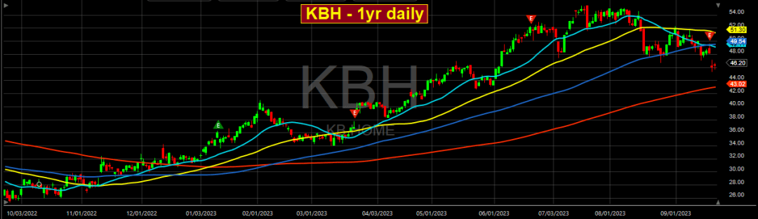 The stock is technically oversold using the RSI and MACD. If the 10yr yield falls over the next couple of weeks, it might stimulate homebuilder buying by hedge fund algos. But liquidity continues to drain from the banking system, while the Fed postures to keep rates higher than expected for longer than expected. One more thing. At some point, there will be big inventory write-downs. KBH has already slashed prices for four quarters consecutively. In Q3, prices were cut 8% YoY and 4% from Q2. It will have to continue slashing prices, particularly as unsold homes from canceled contracts become spec homes that just sit collecting cobwebs.