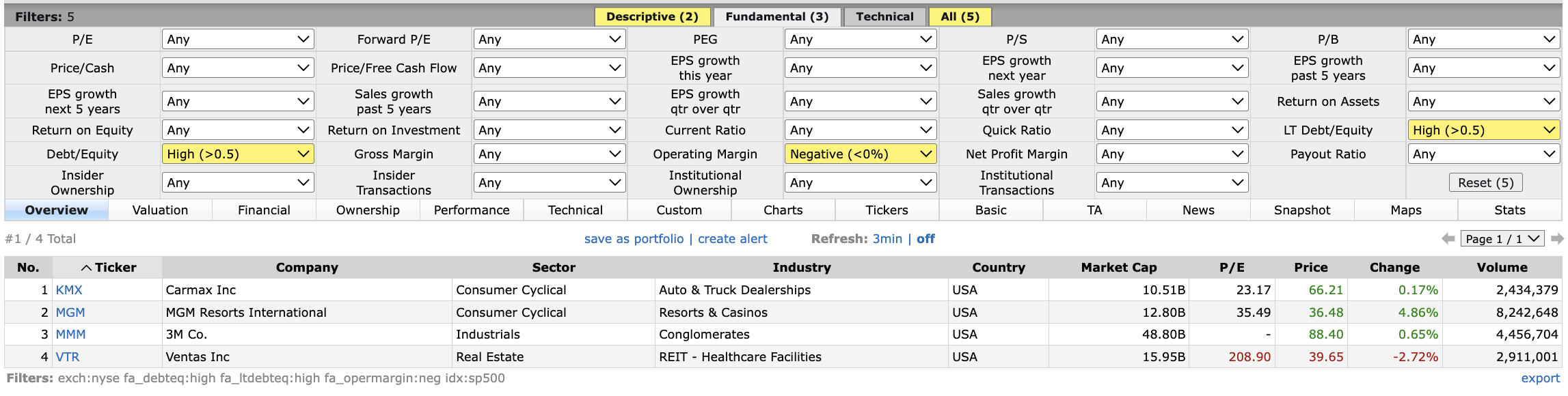From the above screener, there were a total of 4 companies namely Carmax Inc, MGM Resorts International, 3M Co and Ventas Inc. These companies are losing money (making losses) and have significant debts on hand. If these are sustained, the companies would be at risk.