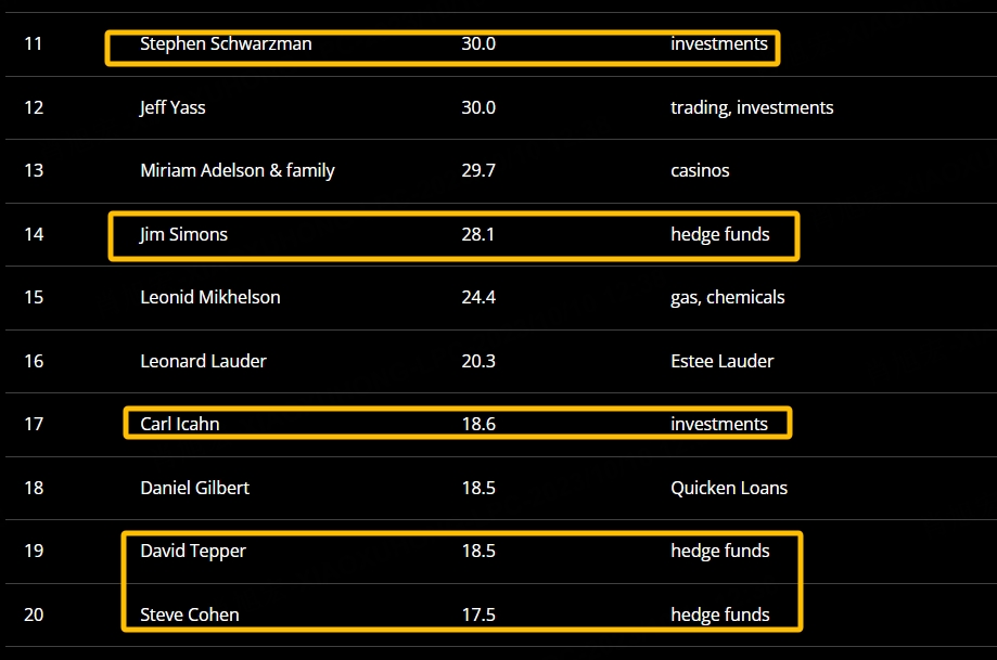 In the list of top 20 Jewish billionaires of 2022, some of them are famous in finance area: Stephen Schwarzman, Jeff Yass, Jim Simons, CarlIcah, David Tepper, Steve Cohen, and so on.