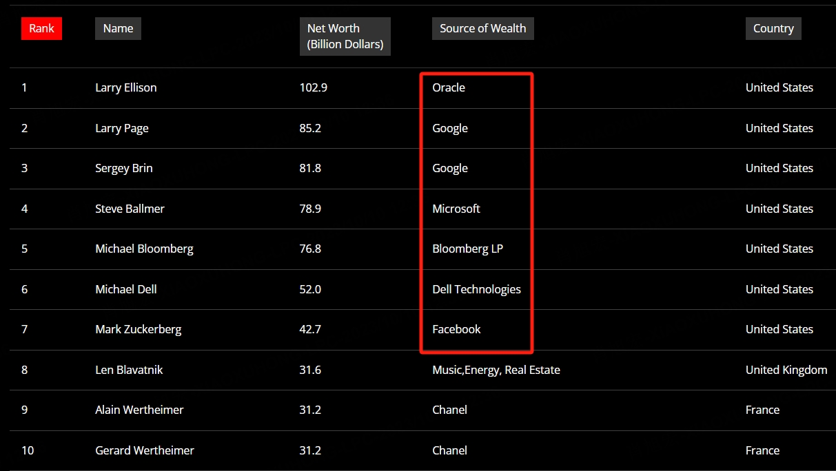 Larry Ellison , chairman, chief technology officer and co-founder of software giant $Oracle(ORCL)$, who is ranked 1st, then Sergey Brin.