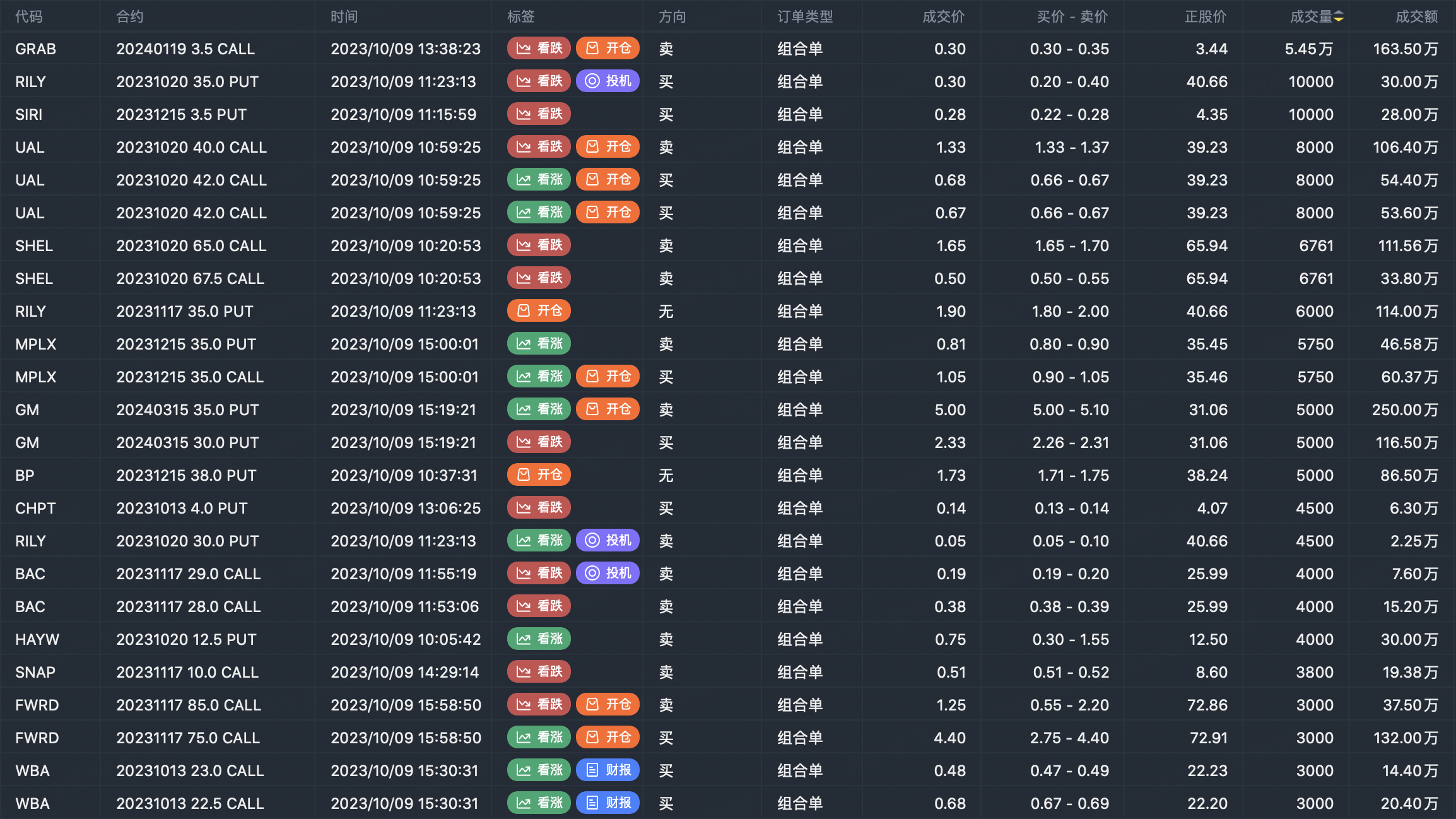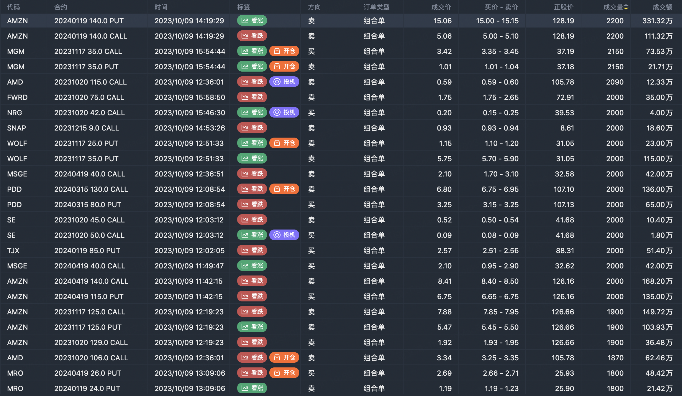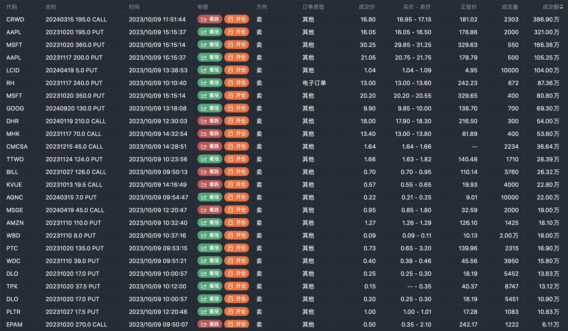 Note: This image data is from Tiger PC. This screen is a significant sell open position for an option contract in the market. A sell of a call option means that the trader believes that the underlying trend has peaked, and a sell of a put option means that the trader believes that the underlying trend has bottomed. These contract openings typically indicate significant activity in the underlying stock, including whether the trader is willing to accumulate a long or short option position.