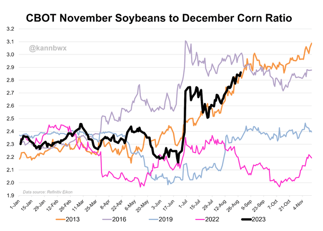 However, on Aug. 30, the Soybean/Corn ratio surged to 2.84. At that time, soybeans were trading at approximately $13.70 per bushel, while corn was priced at around $4.82 per bushel.