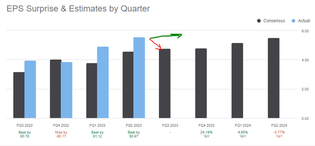 In terms of catalysts to look for in the coming months, CAT's Q3 earnings at the end of October will be a key indicator for short-term performance. In the first two quarters of the year, CAT handily beat expectations as the market remained strong and recession fears fell. However, consensus estimates for Q3 have not been significantly adjusted upwards (analysts have moved up, but a decline in earnings is still expected). This is surprising as CAT had two of their top earnings reports of the past few years and the economic momentum seems to be lasting. Therefore, there may yet be an upside surprise even analysts remain wary.