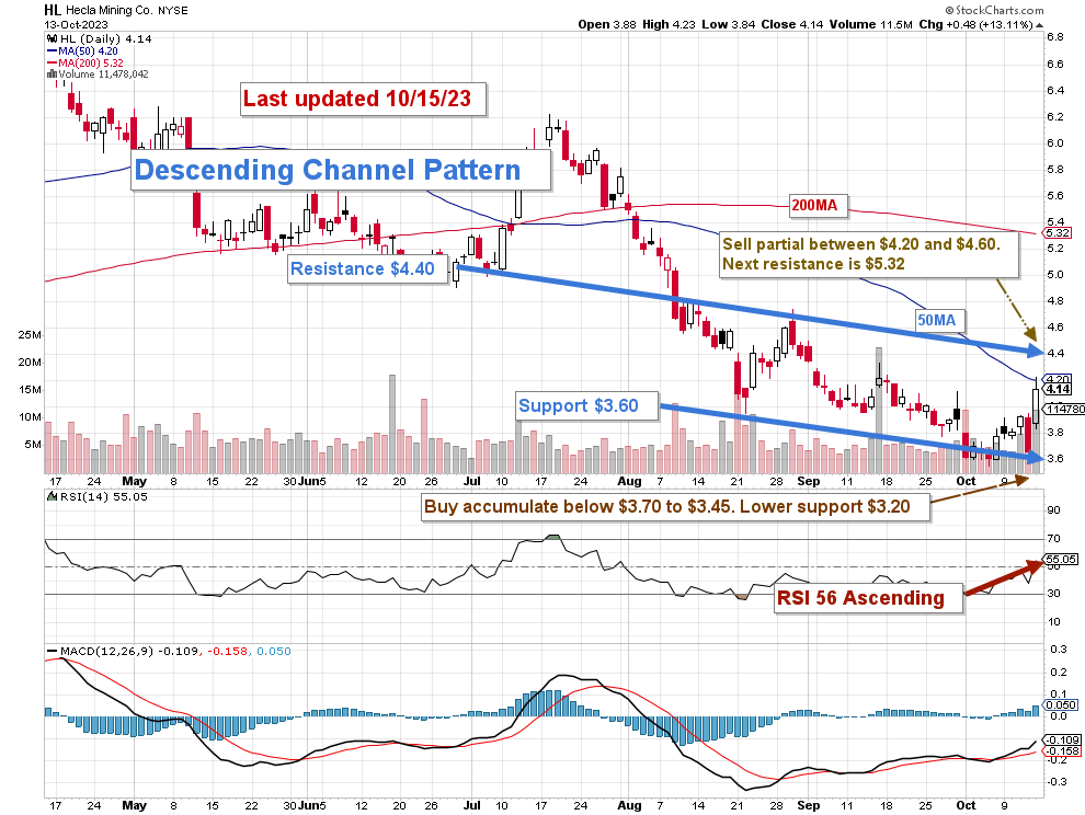 HL forms a descending channel pattern with resistance at $4.40 and support at $3.60.