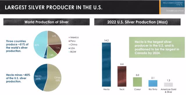 As I have said previously, the company is mistakenly considered a silver miner. Even so, Hecla Mining is the United States’ largest silver miner, producing 45% of all the silver mined. However, it represents only 1.8% of the total Production worldwide.