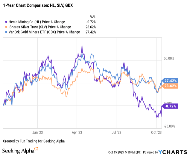 We can see that HL has underperformed the VanEck Vectors Gold Miners ETF (GDX) and the iShares Silver Trust (SLV) on a one-year basis.