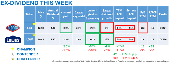 Clorox $Clorox(CLX)$ and Lowe's $Lowe's(LOW)$ will both pay dividend on OCT24.