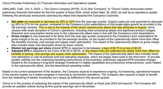 And CLX is about to report a terrible quarter due to a "cybersecurity attack" Earnings Nov 1st