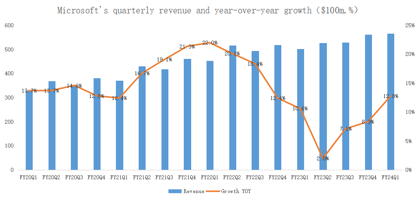 Specifically, Microsoft F24Q1 revenue was $56.517 billion, up 12.8% from a year earlier, exceeding the analyst consensus of $54.54 billion, and also exceeding the revenue guidance range of $53.8-54.8 billion given by management. Revenue growth returned to double-digit growth after three quarters, which is to be congratulated: