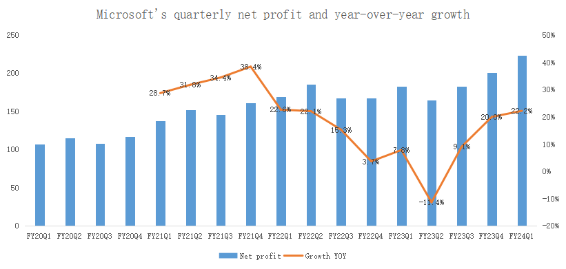 After the combination of the two, Microsoft's net profit soared to $22.29 billion in the first quarter, up 22.2% from a year earlier, significantly exceeding the 12.8% revenue growth rate, with a net interest rate of 39.4%: