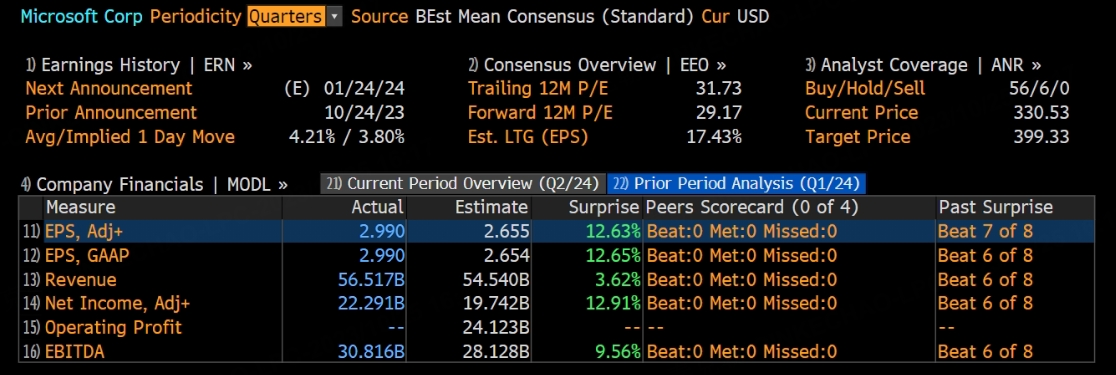 After the US stock market closed yesterday, $Microsoft(MSFT)$ released its first quarterly report for the fiscal year 2024, with revenue and profit exceeding expectations in response to the data up to the end of September: