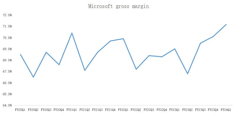 AI not only led Microsoft to return to double-digit growth, but also improved profitability. Microsoft's gross margin reached 71.2% in the first quarter, a new high, an increase of 2.2% over the same period last year: