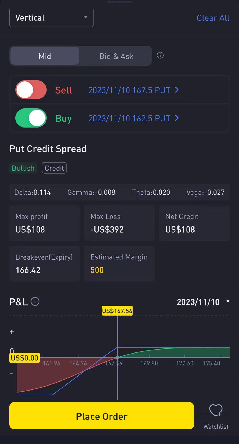 According to the calculation of the Tiger app portfolio options computer, when the stock price is above $167.56 at the expiration of November 10, it can make a profit of $108, and the total margin of the strategy is only $500.