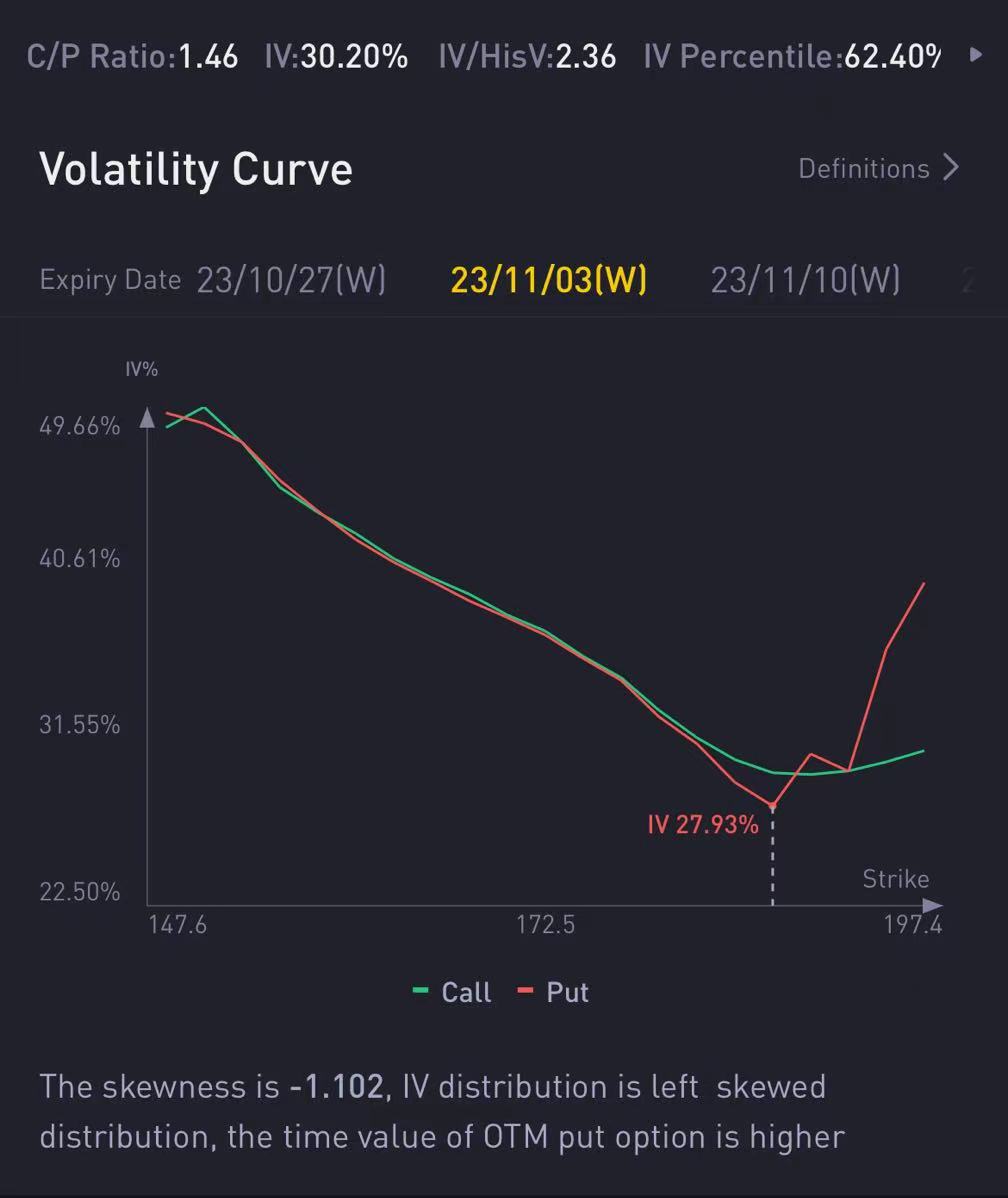 Implied volatility in options expiring during the earnings week was 30%. Apple's expected stock price trend during the earnings announcement is ±7.4 dollars, and the expected price range is 166 to 180.8, less than 5% of the current stock price. That's a lower drop than other tech stocks' earnings expectations.