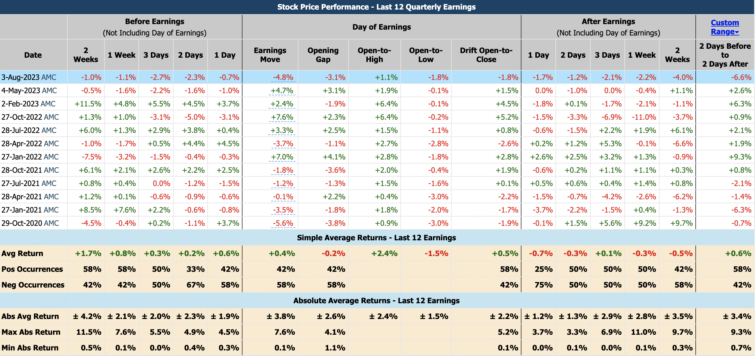 Apple's average stock price change before earnings is expected to be ±4.6%. The actual change averaged ±4.3%, 0.3% lower than the average forecast change. Shares rose or fell ±1.7% after the opening bell. The average 1-day return of the straddle strategy is -0.4%, so the straddle strategy is not suitable for Apple's earnings report.