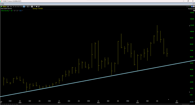 Using what I believe to be a fair multiple of 28.0x EV/EBITDA to adjust for its incredible growth and even being generous and using FY2025 EBITDA estimates of ~$30 million, I see a fair value for the stock of ~$840 million or $74.30 per share to its 2-year price target. And while this fair value estimate points to a 13% upside to fair value, I am looking for a minimum 30% discount to fair value for non cyclical names trading at sub $1.0 billion valuations for starting new positions, and ideally 35%. So, even if we use the less conservative end of this range, KRUS' ideal buy zone comes in at $52.00 or lower. Hence, although the stock may be down substantially from its highs, it's hard to argue that it's cheap, and it remains extended above its long-term uptrend-line (current support at ~$50.00) with unfilled gaps below. Therefore, I see the reward/risk as balanced short-term, making it hard to justify chasing the stock above $67.00 ahead of earnings next month.