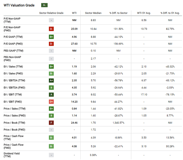 "Value" can mean different things to different people but it is usually associated with low pricing multiples. Seeking Alpha scores the company "A-" on valuation based on how W&T's ratios compare to the peer sector: