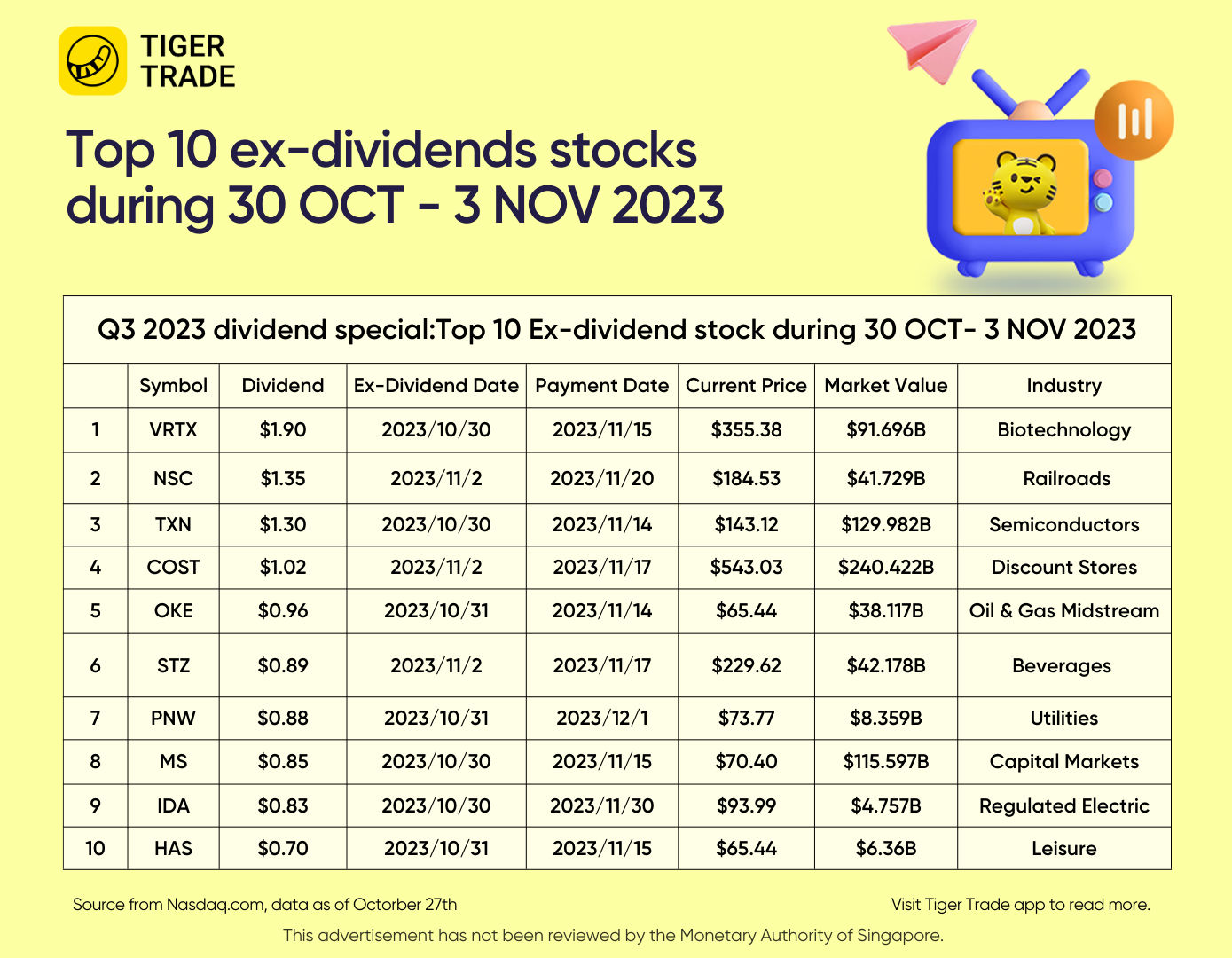 In this week, the top 10 stocks going to ex-dividend are $Vertex Pharmaceuticals(VRTX)$ , $Norfolk Southern(NSC)$ , $Texas Instruments(TXN)$ , $Costco(COST)$ , $ONEOK Inc(OKE)$ , $Constellation(STZ)$ , $Pinnacle West Capital(PNW)$ , $Morgan Stanley(MS)$ , $Idacorp(IDA)$ ,and $Hasbro(HAS)$ .