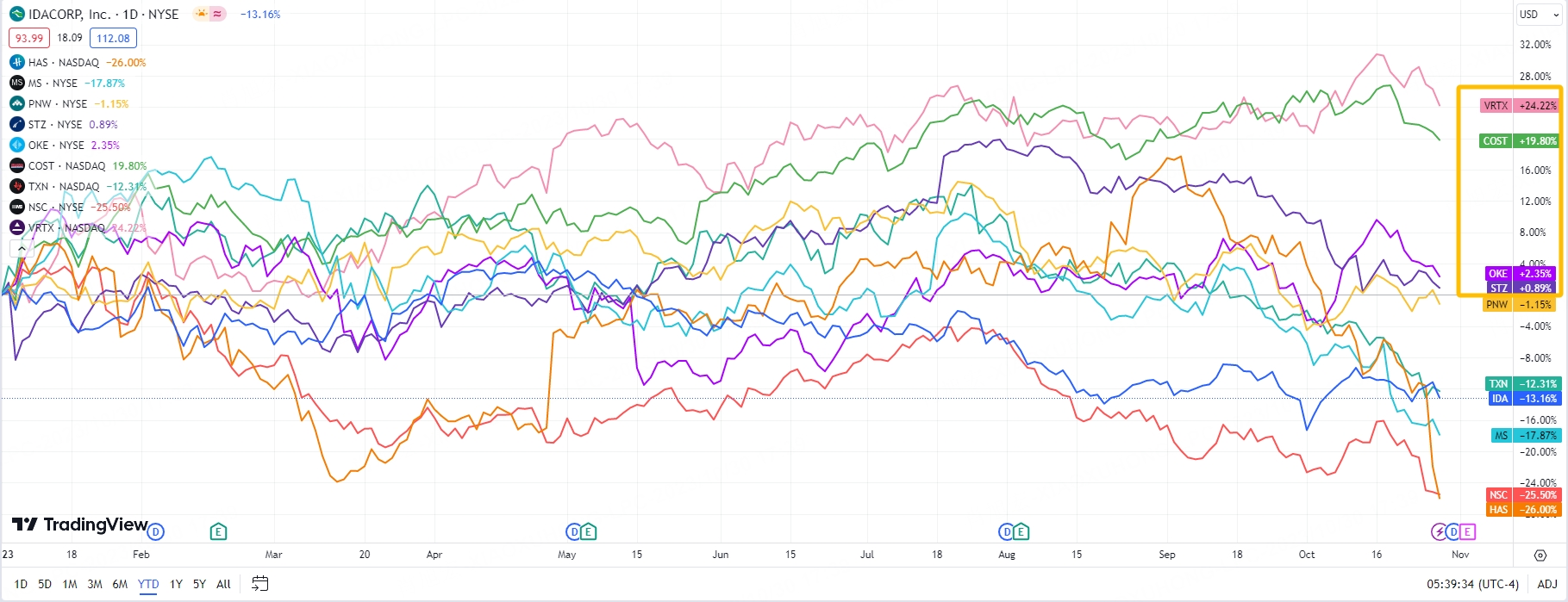 Below is the YTD 2023 of the 10 stocks, 3 of which have a positive return in 2023: $Vertex Pharmaceuticals(VRTX)$ , $Costco(COST)$ , $ONEOK Inc(OKE)$ .