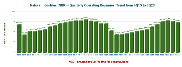 Nabors Industries reported third-quarter 2023 operating revenues totaling $733.97 million, up from $694.14 million in the same quarter last year (please see the chart above).