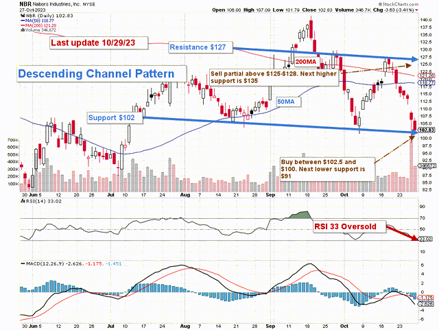 NBR establishes a descending channel pattern, with support at $102 and resistance at $127. At 33, the RSI is deemed oversold and may indicate a buying opportunity.