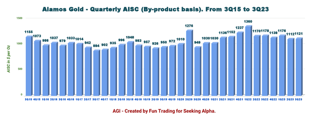 At $1,121 per ounce this quarter, all-in-sustaining costs (AISC) are still low and have increased sequentially from $1,112 per ounce.
